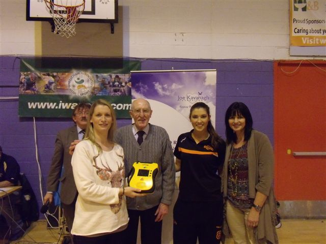 Julie Kavanagh and Caroline Flynn present a defibrillator on behalf of the Joe Kavanagh Foundation, to Grainne Dwyer of Glanmire Basketball Club |